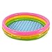 La piscina tiene 3 aros de llamativos colores: rosa, amarillo y verde, el suelo es de color azul