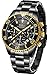 Relojes para Hombre cronógrafo de Acero Inoxidable Impermeable Fecha analógico Reloj de Cuarzo Negocios Casual Moda, Oro Negro, Pulsera