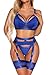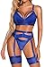 Aranmei Conjunto Lencería Mujer Sexy con Liguero Conjunto Sujetador y Bragas Aros Conjunto Lencería Gótica Recortada con Liguero y Puños Muslo, 4 Piezas, Lin Medias, Azul Real, M