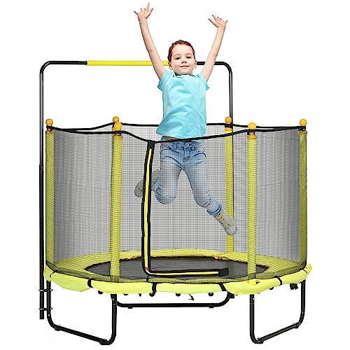 ZONEKIZ Cama Elástica Infantil Ø110 cm Trampolín para Niños de 3-10 Años con Red de Seguridad Barra Ajustable en 3 Niveles y 3 Patas de Acero en Forma de U Carga 50 kg para Interior Amarillo
