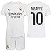 Real Madrid👕 Conjunto compuesto por camiseta blanca con detalles amarillos y dorsal “Mbappé 10” + pantalón corto con escudo oficial.